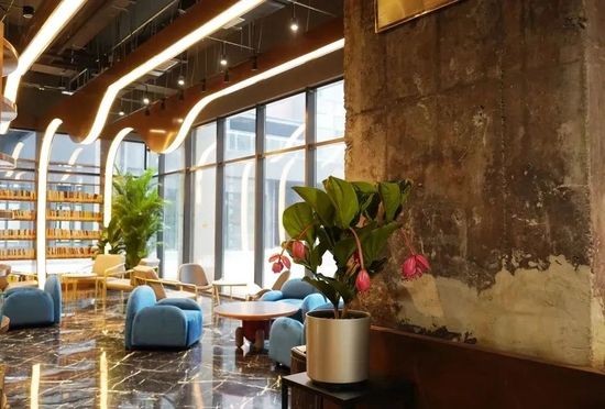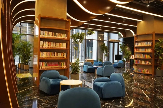 冷暖色系交织的桌椅、环形书架和艺术装置在绿植的装点下,营造出强烈的空间舒适感。